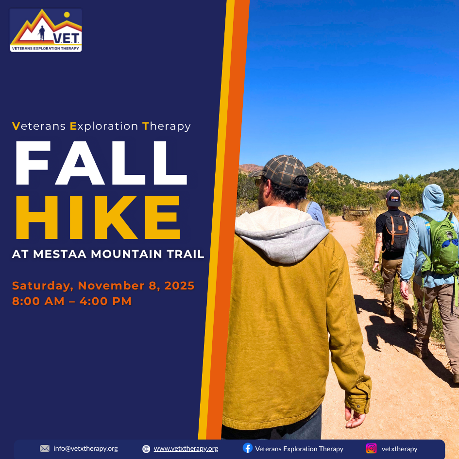 Experience the magic of fall on a guided hike at Mestaa Mountain Trail! This Veterans Exploration Therapy event invites veterans and their families to enjoy a full day outdoors, surrounded by changing leaves, crisp mountain air, and a supportive community.
