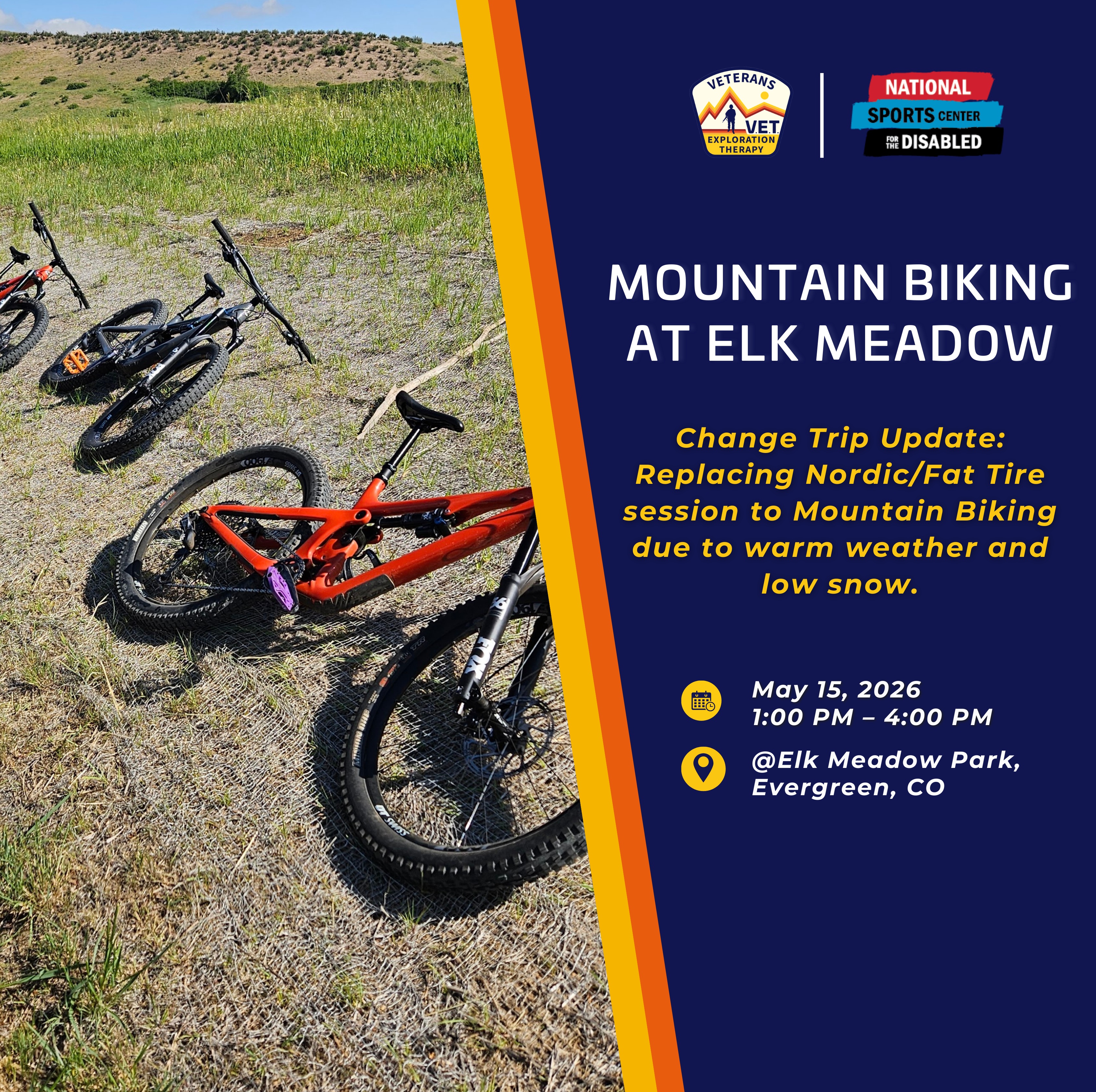 In partnership with the National Sports Center for the Disabled (NSCD), we are hosting a focused mountain biking session at Elk Meadow Park. This trip is designed for veterans of all ability levels to build confidence on the trails, master new skills, and connect with a community of fellow service members.